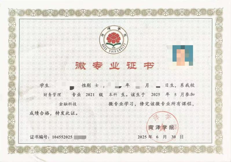 学生修读完成全部课程,成绩合格即取得15学分后,经商学院审核,报菏泽学院批准,颁发“金融科技”微专业证书,证书信息纳入学校学籍管理系统,学信网可查询,作为学生跨领域就业、升学的重要能力证明。