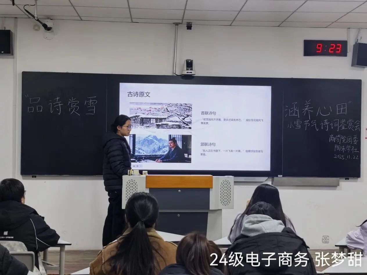 为传承中华优秀传统文化,以诗词之美滋养心灵、涵养商学人文底蕴。11月22日,商学院在8号楼201教室举办“品诗赏雪,涵养心田”小雪节气诗词鉴赏会,商学院同学们积极参加本次比赛。