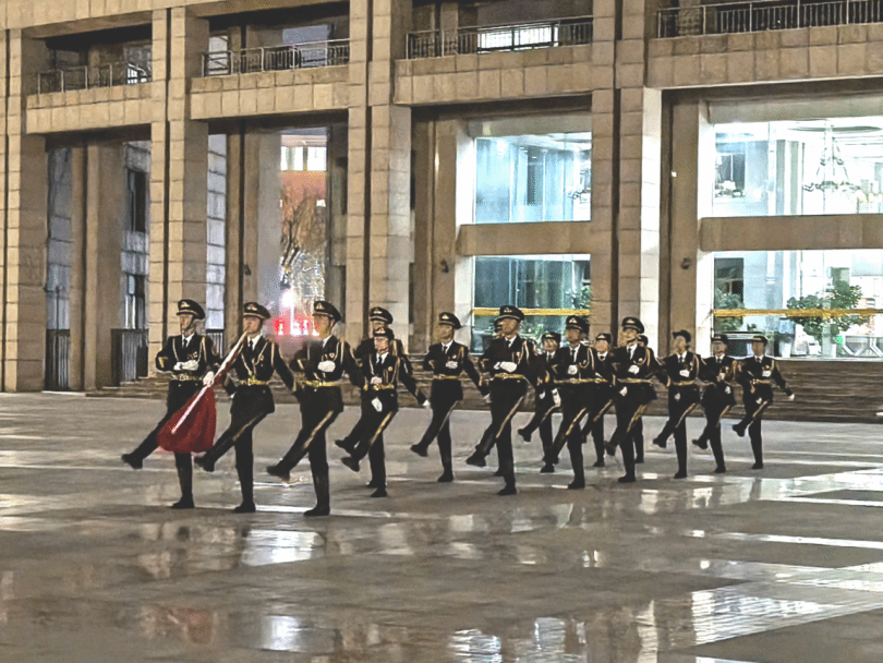迎着初升的朝阳,国旗护卫队队员身着整齐服装,迈着铿锵有力、整齐划一的步伐,护送国旗走向升旗台。他们身姿挺拔、目光坚定,每一步都彰显着青春的朝气与担当。