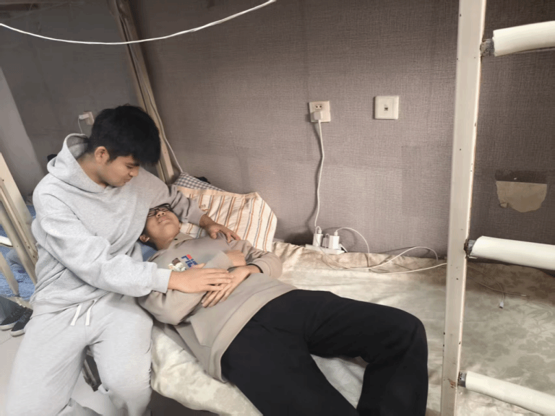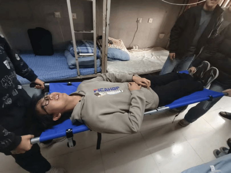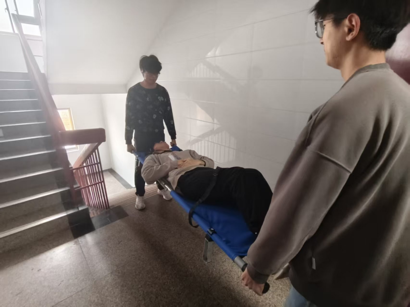 应急演练过程中,参演同学分工明确、配合默契。发现舍友突发不适后,部分同学立即留守照看,密切关注患病同学的状态;部分同学迅速行动,分头联络老师与宿管说明情况;还有同学火速前往医务室借取担架。各环节衔接紧凑、有条不紊。演练记录组同学全程跟进,用镜头完整捕捉从发病处置、下楼转运到医务室诊断的每一个操作步骤,为后续复盘留存了清晰详实的影像资料。
