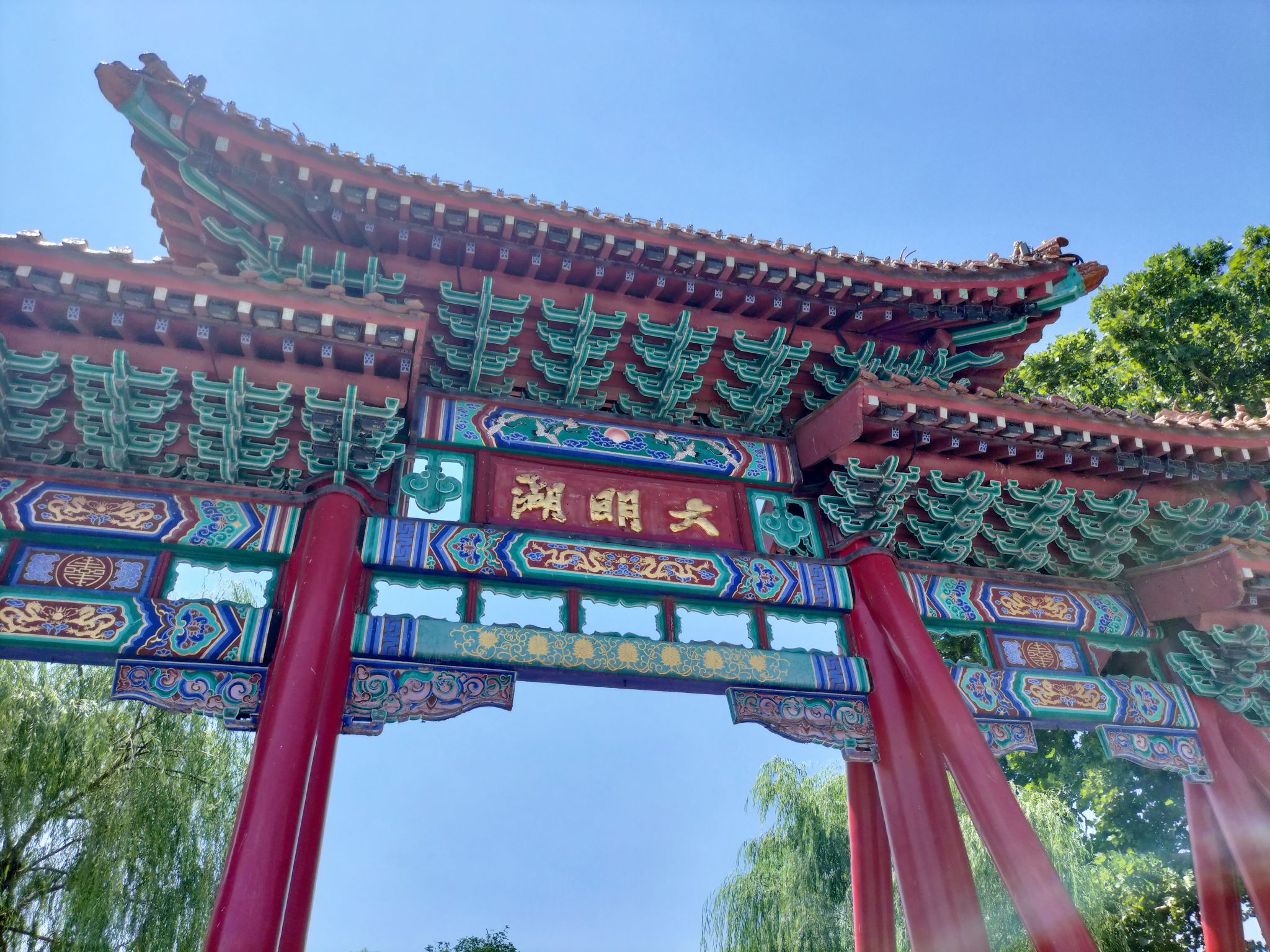 从趵突泉出来,沿着护城河走到大明湖。红柱彩檐的牌坊下,垂柳已悄悄冒出新芽,预示着春的脚步。湖面上,游船点点,岸边的祈福牌随风轻晃,上面写满了人们对新年的期盼。
