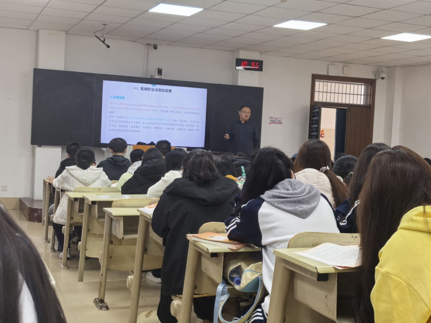 课程中,朱贺副书记从职业决策、个人经历、职业发展趋势三个维度展开讲述。他通过分享自身职业历程与身边从业者的成长故事,解析职业选择中的关键影响因素,帮助大家规避“盲目跟风”“自我认知偏差”等决策误区。同时结合当下行业变革动态,他深入分析各领域的发展前景与人才需求变化。讲解过程中,朱贺副书记引导同学们结合自身情况思考职业发展方向,对同学们提出的问题,给予了细致解答。课程尾声,朱贺副书记勉励大家“尽早明确方向,在实践中不断打磨能力,让职业规划成为成长的‘指南针’”。