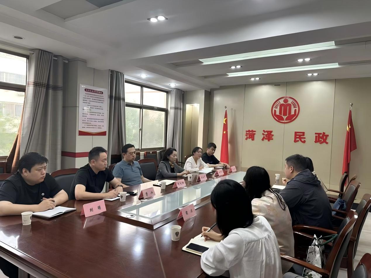 5 月 10 日,商学院经济系教工党支部与菏泽市民政局合作课题研究座谈会在市民政局召开。市民政局副局长朱人和、社会救助(养老)服务中心副主任李瑞芹及相关科室负责人,商学院经济系教工党支部骨干教师李翔、马飞、荣洁等参会。