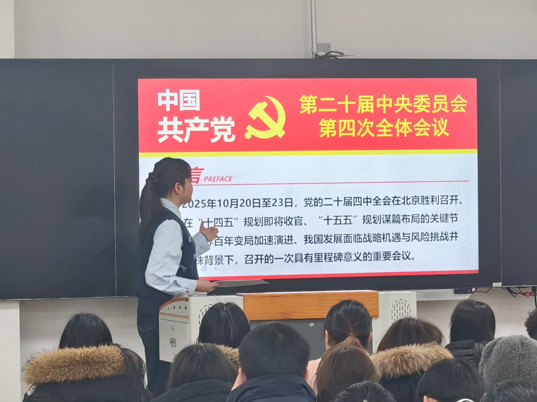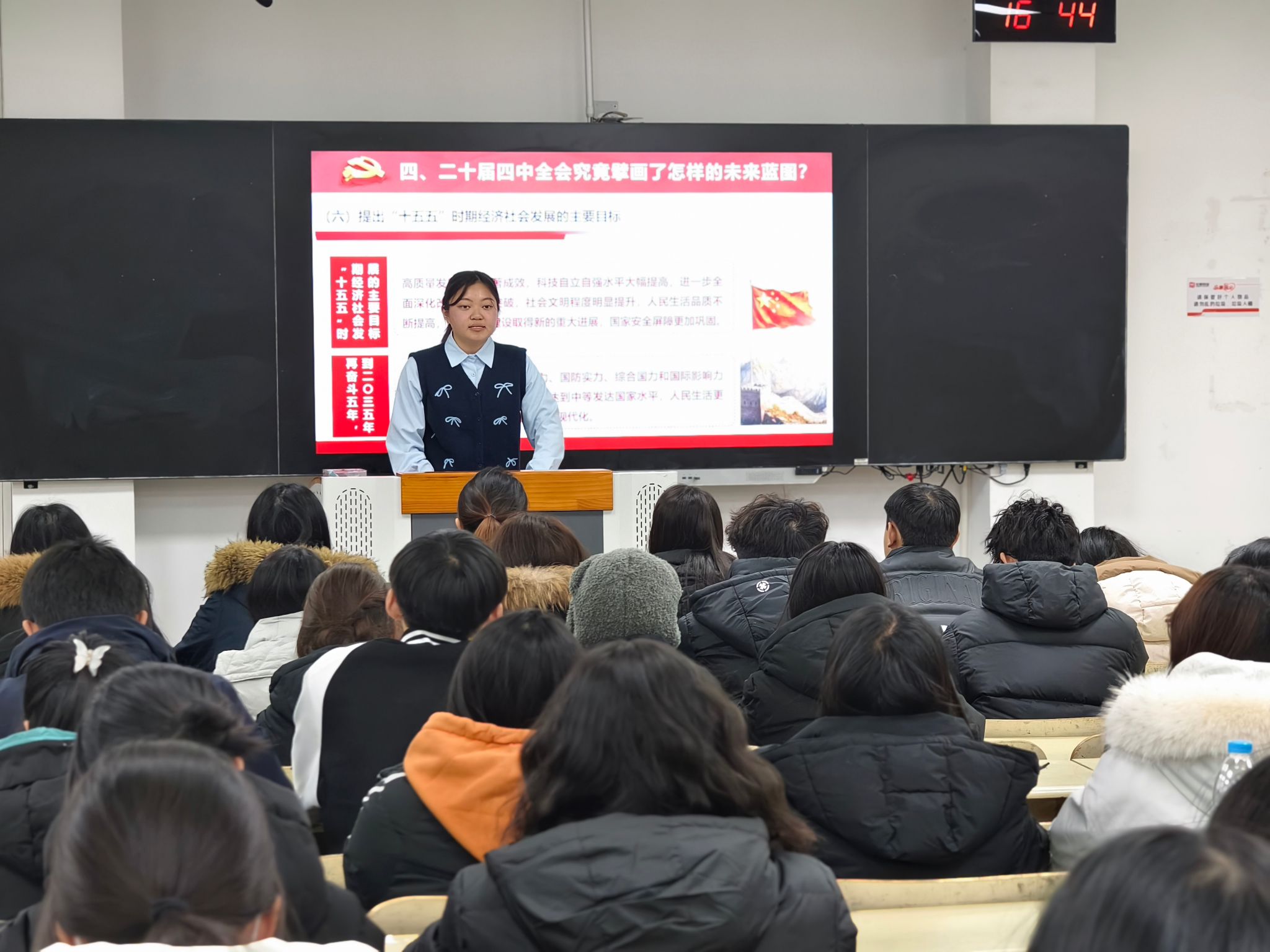 12月14日,商学院于8号教学楼212教室举办党的二十届四中全会精神宣讲活动,由学校青年师生宣讲团成员郑彤炜担任主讲人。